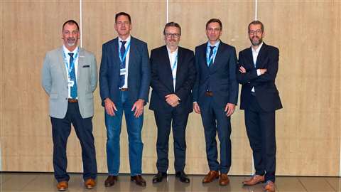 Pictured from left to right: Jeff Jurgens (AEM), Andrew Olliver (CNHi), Christian Adler (Kuhn), Adrian Hackfort (AGCO) and Norbert Schlingmann (AEF). (Photo: Agricultural Industry Electronics Foundation)