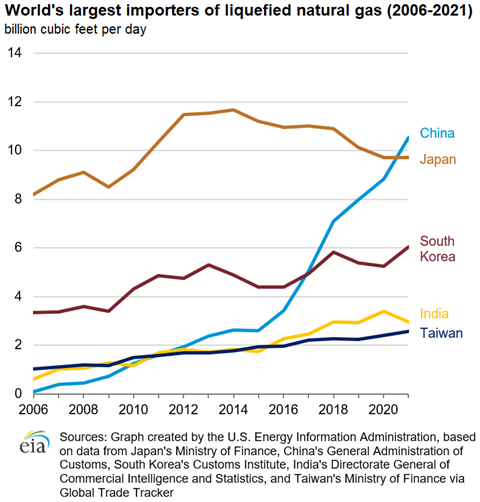 Prior to 2021, Japan had been the largest importer of LNG for 51 years. China imported around 10.5 Bcf/d in 2021, up 1.7 Bcf/d from 2020 and 0.8 Bcf/d more than Japan, the EIA reported. Data from Japan’s Ministry of Finance showed that country averaged 9.7 Bcf/d in 2020 and 2021.