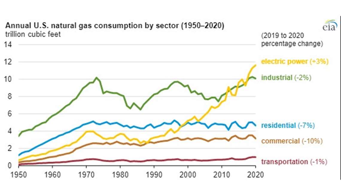 The U.S. Energy Information Agency (EIA) reports that in 2020, both natural gas consumption by the U.S. electric power sector and natural gas exports reached record highs.