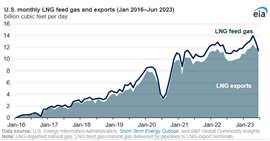 LNG feed gas set a monthly record in April 2023 at 14.0 Bcf/d, supported by high international demand for U.S. LNG exports, particularly in Europe. LNG feed gas declined slightly in May and June and averaged 13.0 Bcf/d and 11.5 Bcf/d, respectively, primarily because of maintenance at several U.S. LNG export facilities, including Sabine Pass and Cameron.